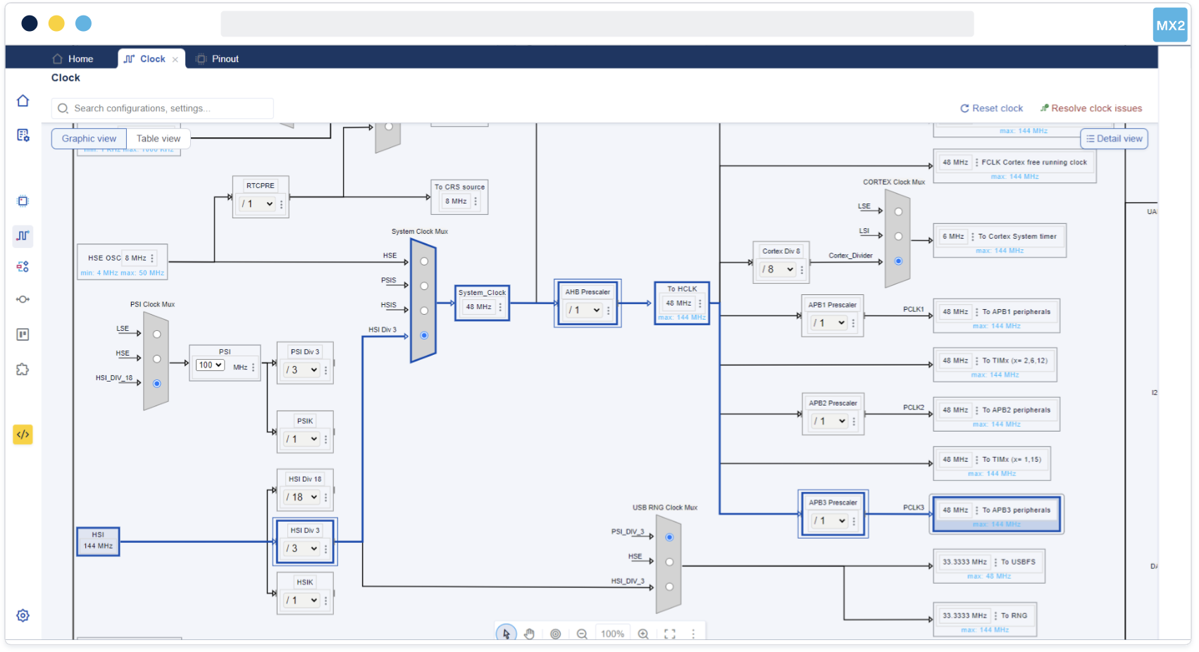 クロック・ツリーとその設定を可視化し、自動ソルバを使用してニーズに応じてクロックを調整します。