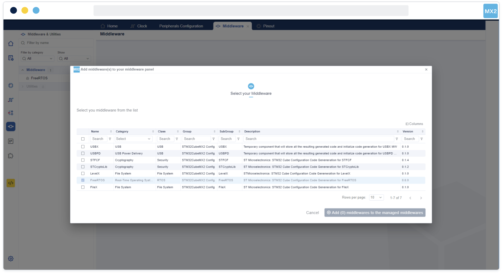 追加のソフトウェア・パッケージおよびそれらの依存関係を管理します。パッケージをプロジェクトに追加し、他のネイティブ・ペリフェラルやミドルウェアと同じように設定します。