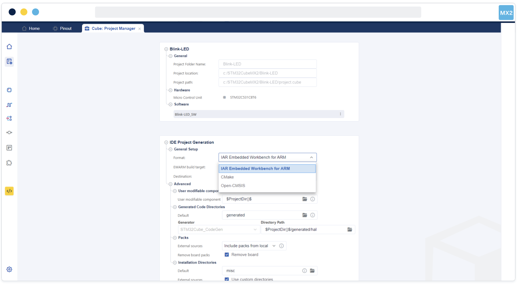 プロジェクト設定を微調整し、IDEツールチェーンを選択します。その後、Cコードを生成し、選択したすべてのライブラリをプロジェクトに組み込みます。