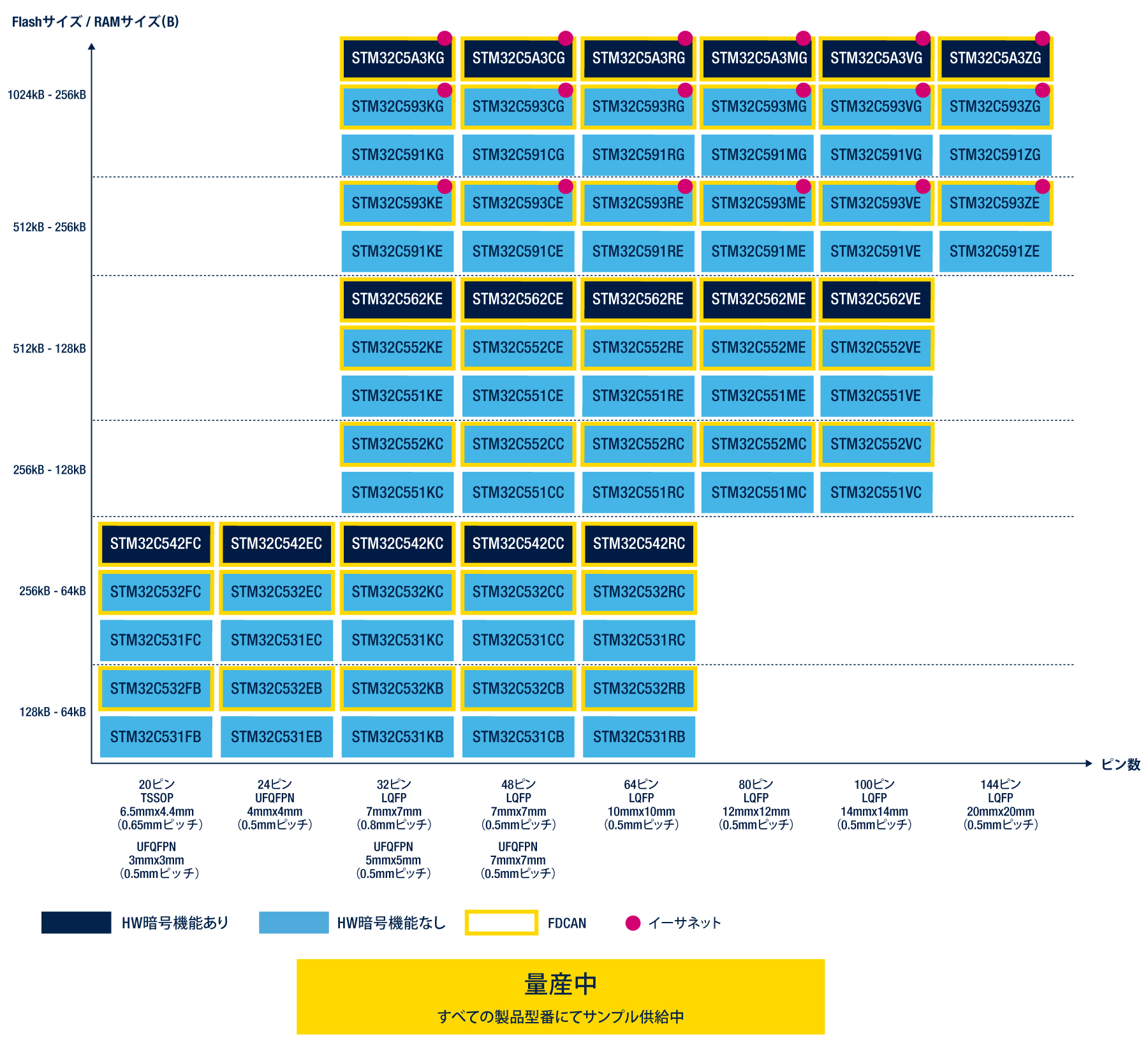 | 製品名 | 周波数(MHz) | CPU | FLASH(KB) | RAM(KB) | パッケージ | ユニバーサルIO | 最小動作電圧 | 最大動作電圧 | 16bitタイマ | 32bitタイマ | モータ制御用タイマ | 低電力タイマ | 12bit ADC | 12bit ADCチャネル数 | 12bit DACチャネル数 | コンパレータ | アンプ | SPI | I2S | I2C | 高速I2C | U(S)ART | LP UART | CAN | USBデバイス | イーサネット | TRNG | AES | SHA | HMAC |