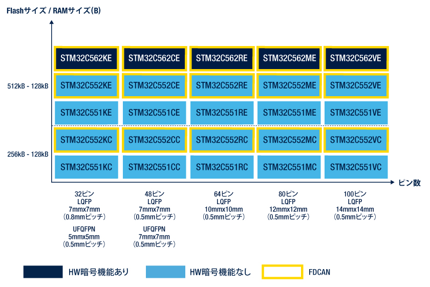 また、HASHやAESによる暗号化などのハードウェア・ベースのセキュリティ機能も搭載しており、32ピン~100ピンまでの各種パッケージ・ラインアップが準備されています。NUCLEO-C562RE開発ボードとSTM32Cubeソフトウェア開発エコシステムを使用することで、試作開発を素早く簡単にスタートできます。動作温度範囲は-40℃~125℃です。