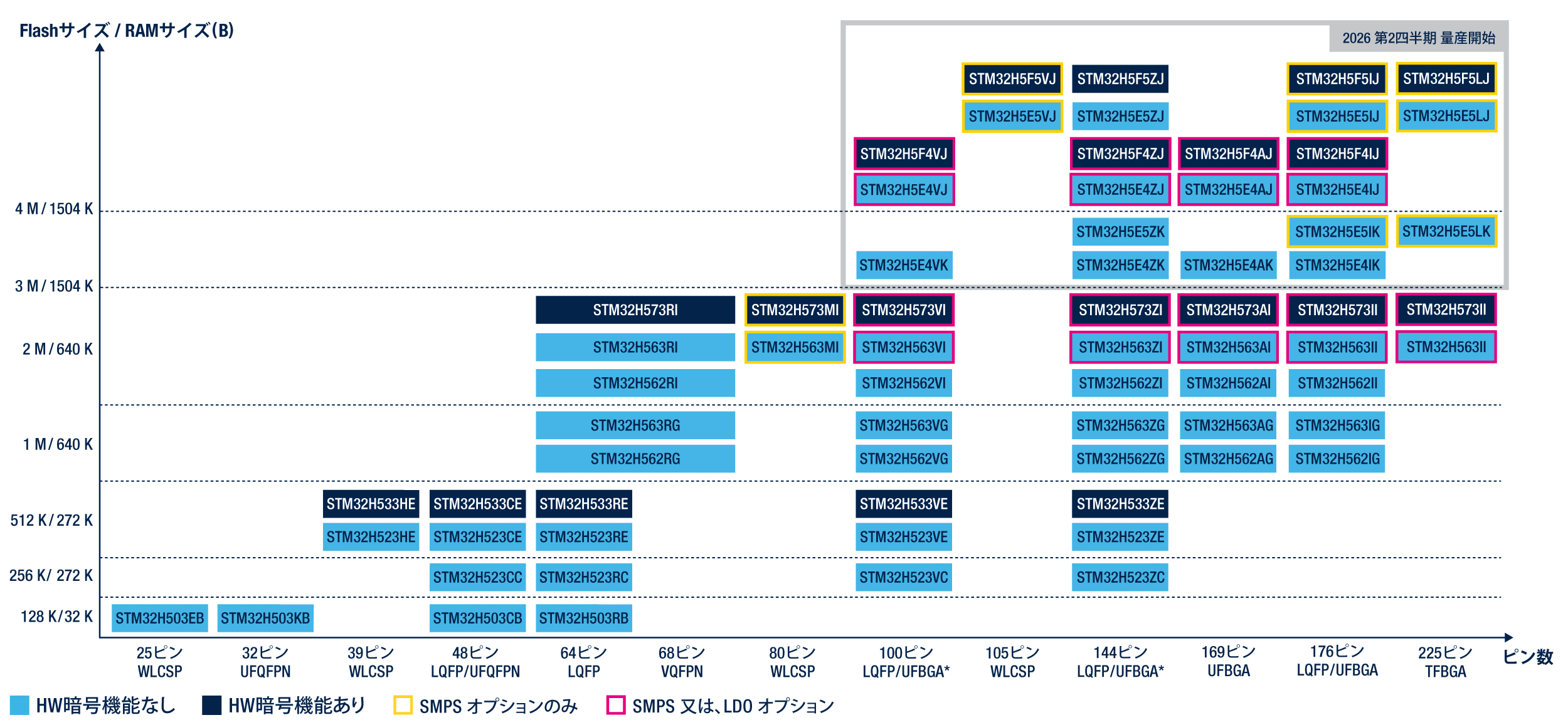 - STM32H5シリーズの高コスト効率を実現した小型サイズ・少ピン・パッケージ・ライン