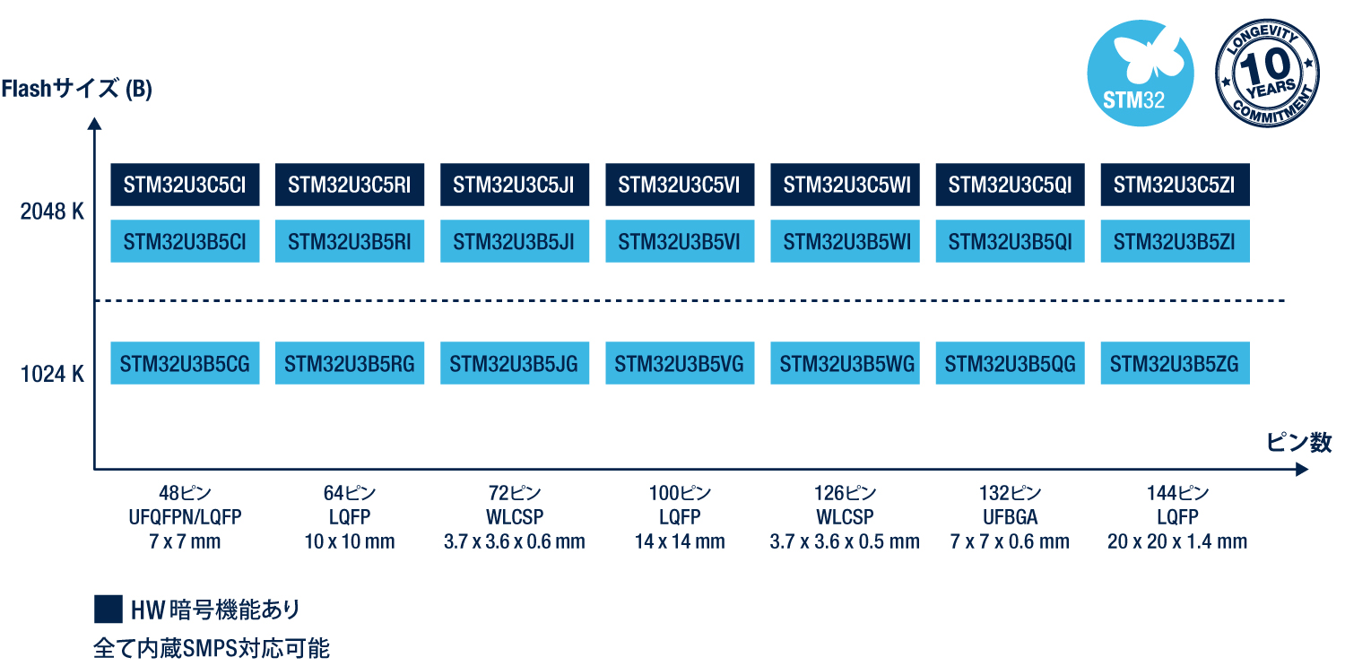 STM32U3B5/3C5シリーズは、Arm® Cortex®-M33コアを搭載し、640KBのRAMと最大2MBのFlashメモリ(デュアル・バンク)を搭載しています。また、FDCANとI3C IPを内蔵し、UFQFPN、WLCSP、LQFP、UFBGAの48ピン~144ピンまでの9種類のパッケージで提供されます。